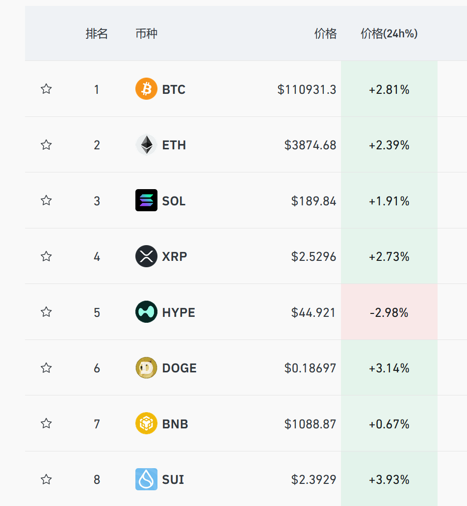 加密货币多数上涨,比特币重返11万美元关口,上涨2.81%,以太坊报3874美元,涨2.39%,狗狗币涨超3%。