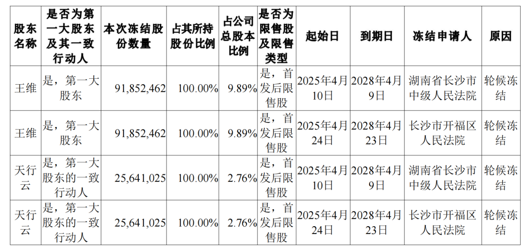 同时,天行云所持有棵树2.76%股份同样分别于今年4月10日、4月24日遭到湖南省长沙市中级人民法院、长沙市开福区人民法院轮候冻结,到期日同样皆为2028年。