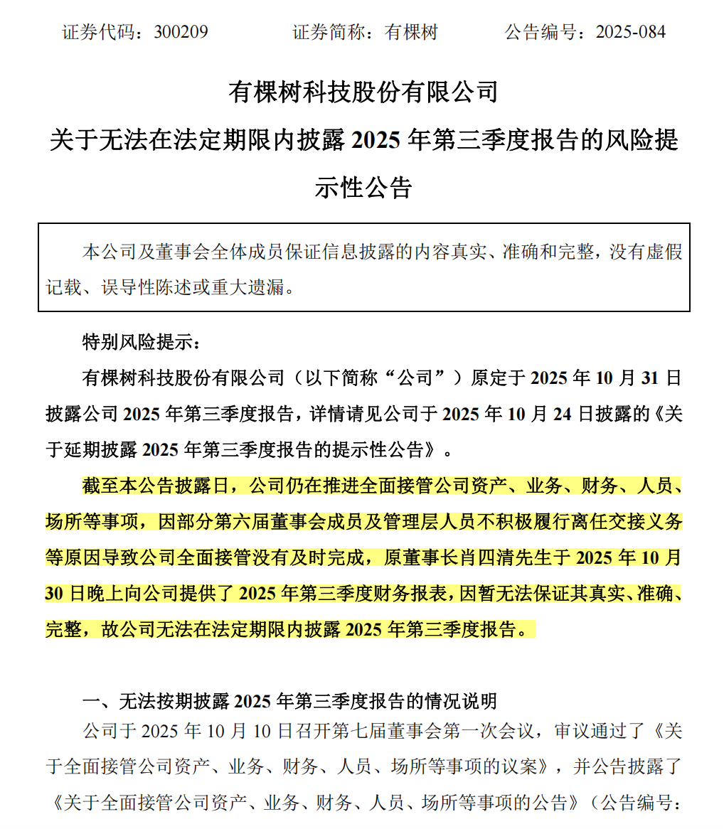 10月31日,有棵树发布风险提示性公告显示,公司原定于10月31日披露2025年第三季度报告,截至公告披露日,公司仍在推进全面接管公司资产、业务、财务、人员、场所等事项,因部分第六届董事会成员及管理层人员不积极履行离任交接义务等原因导致公司全面接管没有及时完成,原董事长肖四清于10月30日晚上向公司提供了2025年第三季度财务报表,因暂无法保证其真实、准确、完整,故公司无法在法定期限内披露2025年第三季度报告。