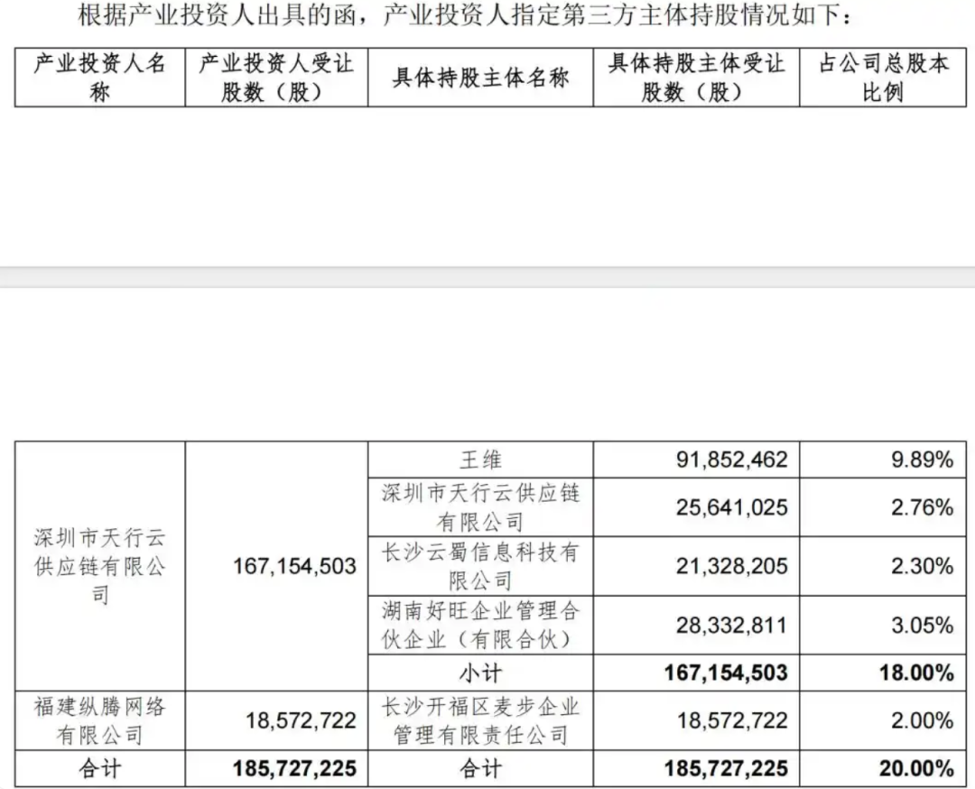 今年3月,法院通过司法扣划方式将有棵树产业投资人受让的转增股份全部过户至产业投资人指定持股主体名下,王维由此直接持股有棵树9.89%股份,成为公司第一大股东。同时,王维及其一致行动人深圳市天行云供应链有限公司(下称“天行云”)、长沙云蜀、湖南好旺合计持股有棵树18.00%股份。