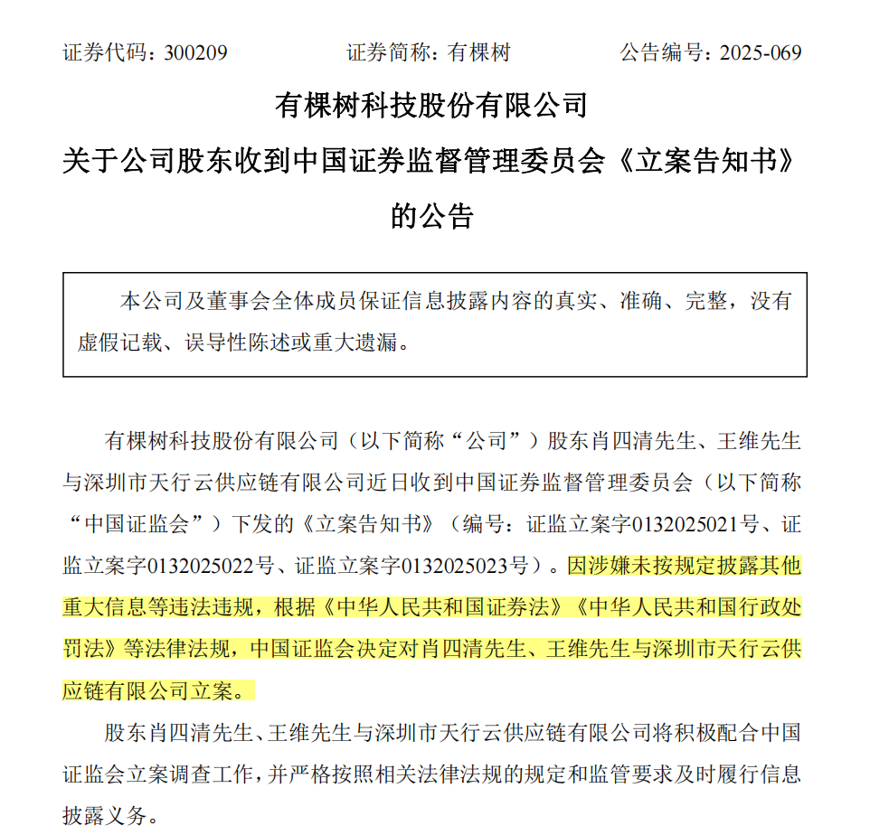 据有棵树公告,9月29日,股东肖四清、王维与天行云收到中国证监会下发的《立案告知书》,因涉嫌未按规定披露其他重大信息等违法违规,根据《中华人民共和国证券法》《中华人民共和国行政处罚法》等法律法规,中国证监会决定对肖四清、王维与天行云立案。