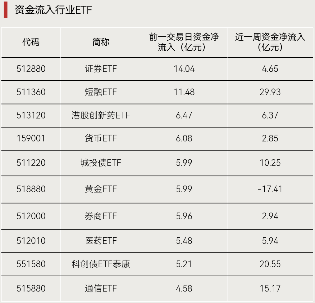 10月30日,证券ETF、港股创新药ETF、医药ETF、通信ETF等多只行业ETF资金净流入额居前。前一交易日,资金流入较多的则是宽基ETF。