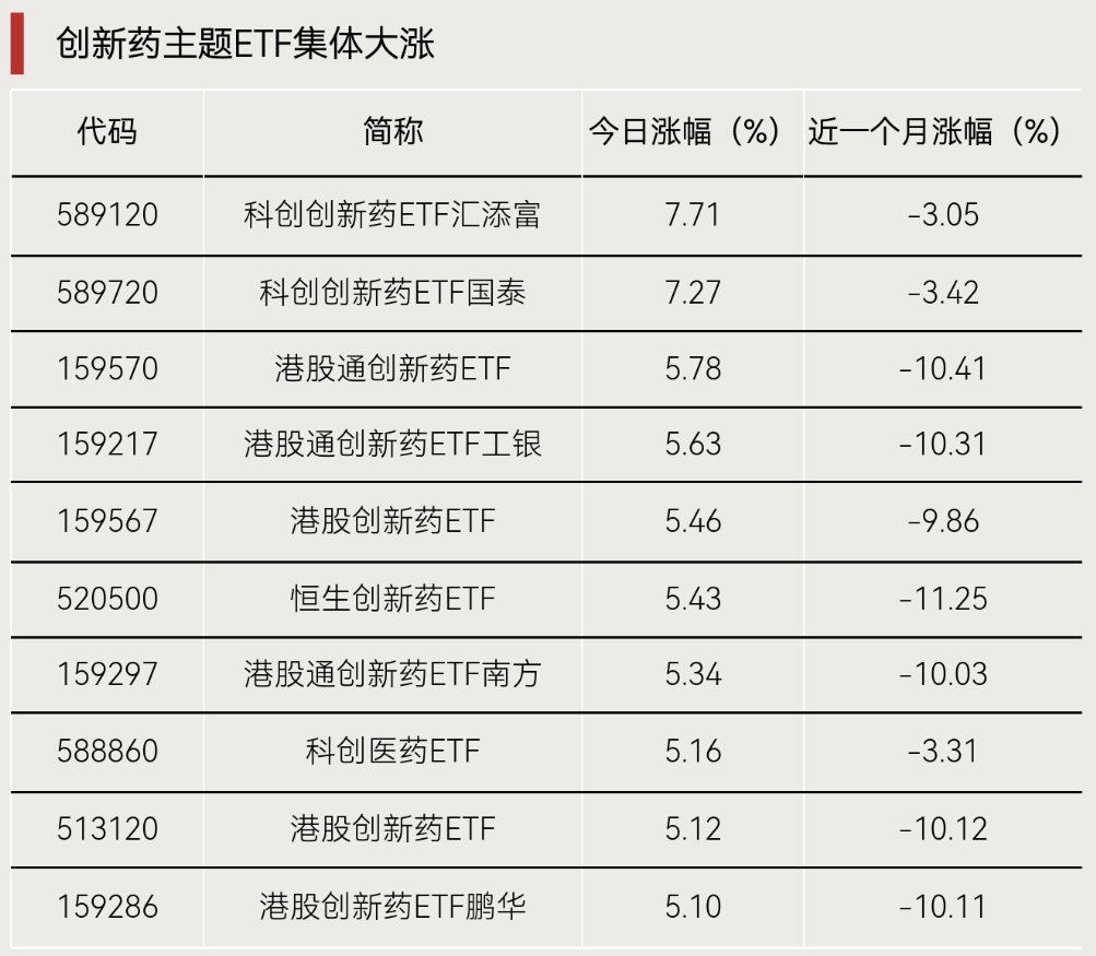 10月31日,创新药板块逆势走强,创新药主题ETF集体大涨,涨幅前十的ETF均是创新药主题ETF。其中,科创创新药ETF汇添富、科创创新药ETF国泰涨幅居前,均超过7%;港股通创新药ETF、港股创新药ETF等涨幅超过5%。