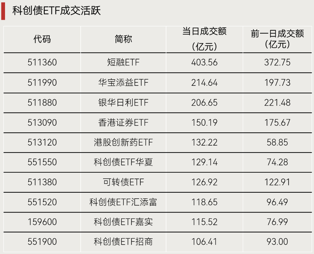 今天,共有11只ETF成交额超百亿元,其中多是债券型ETF,尤其是科创债ETF这一细分品类。