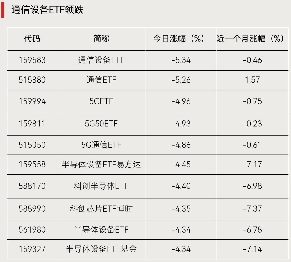 10月31日,工业富联等AI概念股出现调整,通信设备ETF和通信ETF领跌,跌幅均超5%,5GETF、半导体设备ETF易方达、科创芯片ETF博时等跌幅超4%。