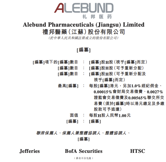 据港交所文件,10月31日,礼邦医药(江苏)股份有限公司向港交所递交上市申请书,联席保荐人为Jefferies、美银证券、HTSC。