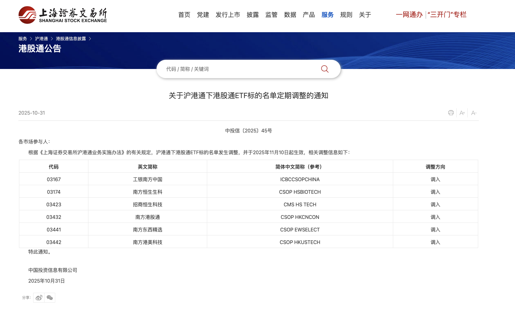 10月31日,记者从沪深交易所官网获悉,“南向ETF通”最新扩容名单出炉。根据《上海证券交易所沪港通业务实施办法》《深圳证券交易所深港通业务实施办法》的有关规定,港股通ETF标的名单发生调整,并于2025年11月10日起生效。