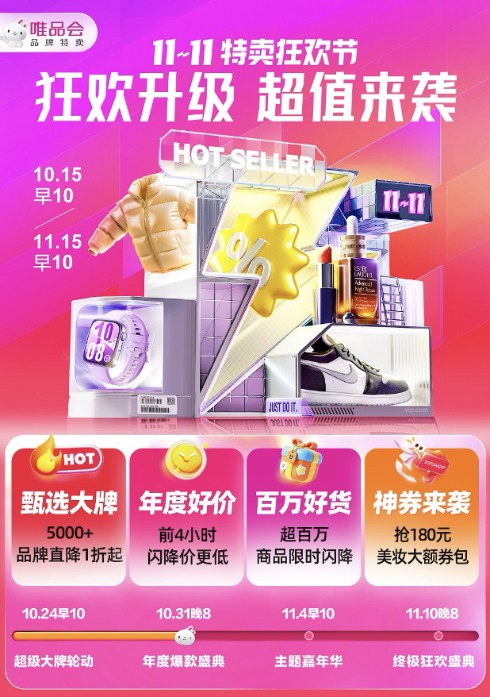 据特卖电商唯品会消息,其11.11特卖狂欢节第二波高潮年度爆款盛典将于10月31日晚8点正式开启。