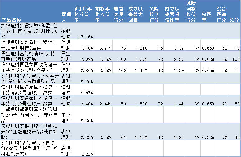 如果从测评分数来看,得分比较高的有“民生理财富竹纯债182天持有期1号理财产品”、信银理财安盈象固收稳健日开12号理财产品A类、“信银理财固盈象固收稳健一年持有期2号理财产品D类”。这三只产品的加权年化收益率也不低,其他时间维度的收益率也表现尚可。