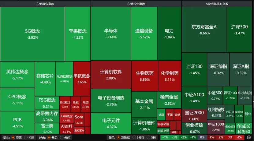 在科技股的领跌下,双创指数跌幅较大。与此同时,市场资金转向创新药等领域。整体来看,市场呈现出指数跌多、个股涨多的态势,共计3760只个股飘红。
