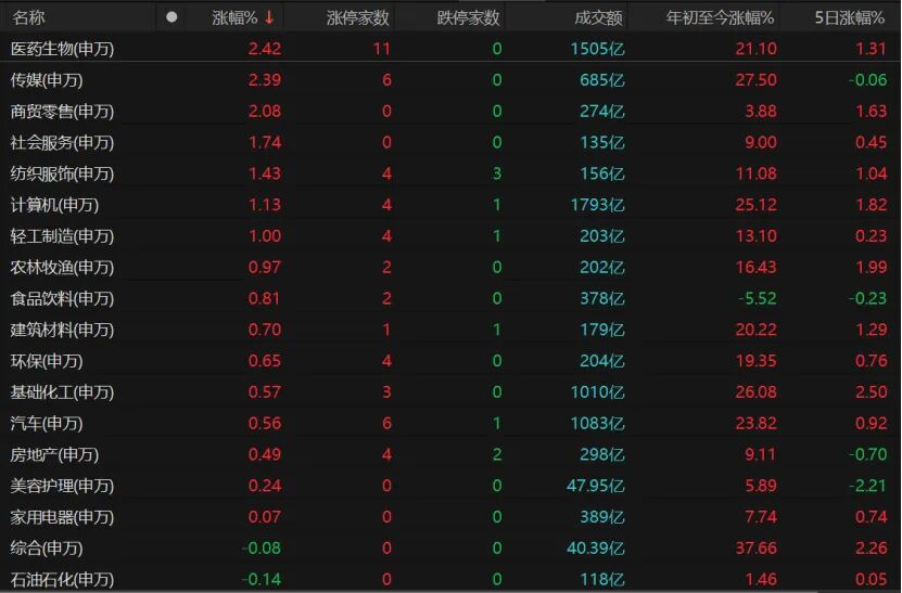今日板块切换较为明显,医药生物、传媒、商贸零售、社会服务等板块表现强势,但通信、电子、有色金属等热门赛道出现较大回调。