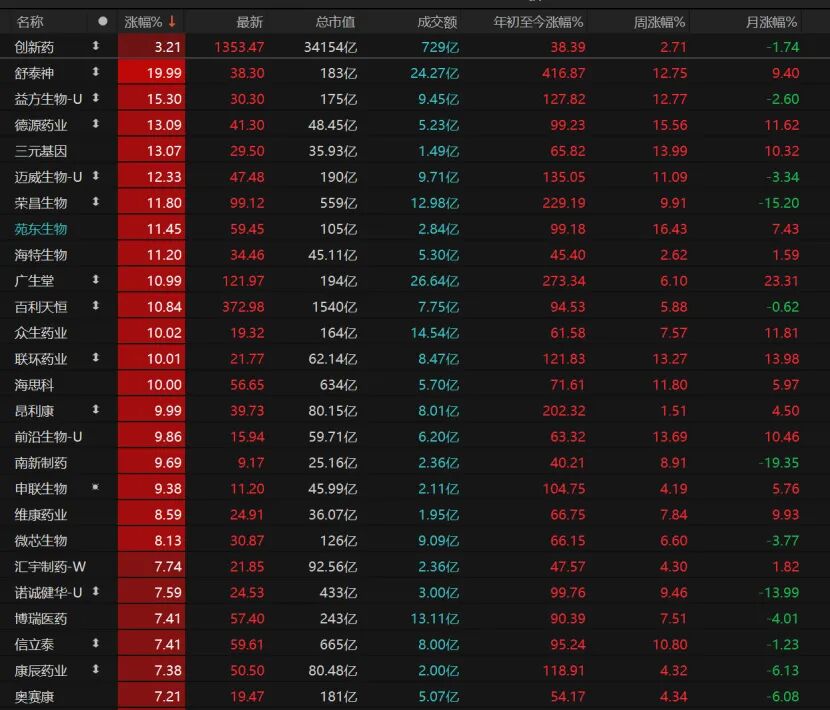 近期回调的创新药板块今日大涨,舒泰神“20cm”涨停,益方生物-U、德源药业、三元基因、迈威生物-U、荣昌生物、苑东生物、海特生物均大涨,众生药业、联环药业、海思科、昂利康涨停。
