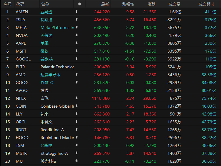 第3名Meta Platforms收跌2.72%,成交372亿美元。美国银行的研究指出,截至目前,今年AI行业的融资规模几乎已与2020年至2024年间所有债务融资总额相当。自9月以来的借款项目包括:甲骨文180亿美元的公开公司债券发行;Meta为其Hyperion数据中心筹集的270亿美元私人债券;Meta进行的300亿美元公开公司债券发行;甲骨文与OpenAI数据中心融资的380亿美元私人贷款交易。