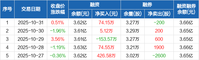 融资方面,当日融资买入2099.99万元,融资偿还2025.83万元,融资净买入74.15万元。融券方面,融券卖出0股,融券偿还200股,融券余量3.27万股,融券余额350万元。融资融券余额合计3.66亿元。