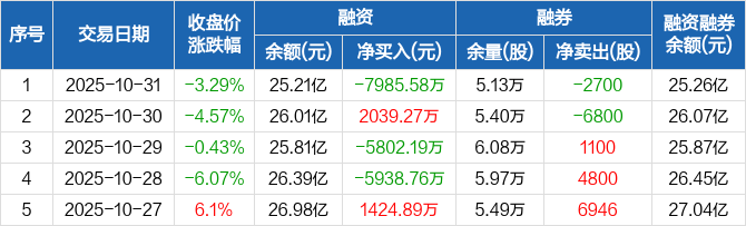 东芯股份:融资净偿还7985.58万元,融资余额25.21亿元(10-31)