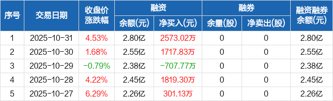 深圳新星融资融券信息显示,2025年10月31日融资净买入2573.02万元;融资余额2.8亿元,创历史新高,较前一日增加10.1%。