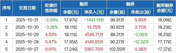 融资方面,当日融资买入1.04亿元,融资偿还1.19亿元,融资净偿还1441.13万元。融券方面,融券卖出8.11万股,融券偿还2.12万股,融券余量96.91万股,融券余额1227.85万元。融资融券余额合计18.09亿元。