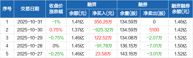 唐山港融资融券信息显示,2025年10月31日融资净买入356.26万元;融资余额1.41亿元,较前一日增加2.6%。