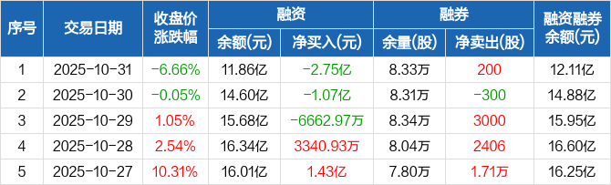 拓荆科技融资融券信息显示,2025年10月31日融资净偿还2.75亿元;融资余额11.86亿元,较前一日下降18.8%。