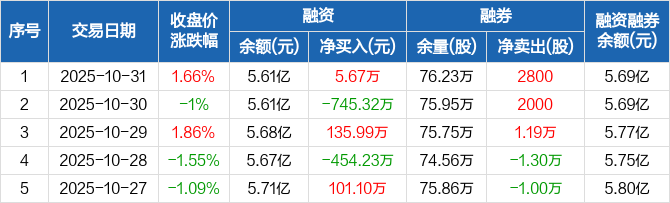 融资方面,当日融资买入4033.51万元,融资偿还4027.84万元,融资净买入5.67万元。融券方面,融券卖出7200股,融券偿还4400股,融券余量76.23万股,融券余额841.58万元。融资融券余额合计5.69亿元。