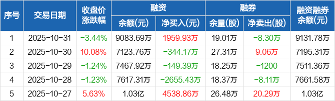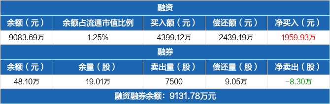 融资方面,当日融资买入4399.12万元,融资偿还2439.19万元,融资净买入1959.93万元。融券方面,融券卖出7500股,融券偿还9.05万股,融券余量19.01万股,融券余额48.1万元。融资融券余额合计9131.78万元。