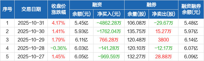 融资方面,当日融资买入1亿元,融资偿还1.49亿元,融资净偿还4862.28万元,净偿还额创12个月新高。融券方面,融券卖出10.87万股,融券偿还40.54万股,融券余量106.08万股,融券余额318.24万元。融资融券余额合计5.48亿元。
