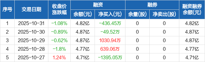 融资方面,当日融资买入1956.51万元,融资偿还2392.96万元,融资净偿还436.45万元。融券方面,融券卖出0股,融券偿还0股,融券余量0股,融券余额0元。融资融券余额合计4.82亿元。