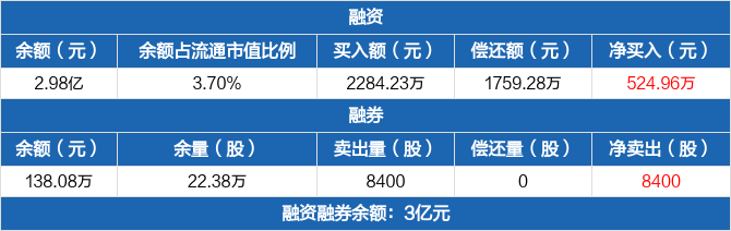 融资方面,当日融资买入2284.23万元,融资偿还1759.28万元,融资净买入524.96万元。融券方面,融券卖出8400股,融券偿还0股,融券余量22.38万股,融券余额138.08万元。融资融券余额合计3亿元。