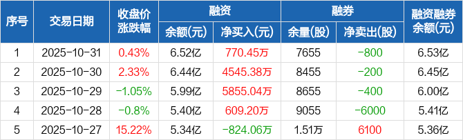 融资方面,当日融资买入1.22亿元,融资偿还1.14亿元,融资净买入770.45万元,连续4日净买入累计1.18亿元。融券方面,融券卖出200股,融券偿还1000股,融券余量7655股,融券余额78.85万元。融资融券余额合计6.53亿元。