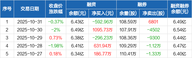 融资方面,当日融资买入1654.98万元,融资偿还2247.94万元,融资净偿还592.96万元。融券方面,融券卖出6801股,融券偿还0股,融券余量108.59万股,融券余额582.05万元。融资融券余额合计6.49亿元。