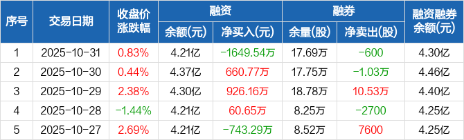 融资方面,当日融资买入4608.74万元,融资偿还6258.27万元,融资净偿还1649.54万元。融券方面,融券卖出3900股,融券偿还4500股,融券余量17.69万股,融券余额939.82万元。融资融券余额合计4.3亿元。