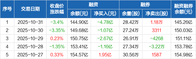 融资方面,当日融资买入9.98亿元,融资偿还14.76亿元,融资净偿还4.78亿元,连续4日净偿还累计9.67亿元。融券方面,融券卖出2.2万股,融券偿还1.02万股,融券余量28.42万股,融券余额3529.1万元。融资融券余额合计145.26亿元。