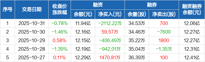 融资方面,当日融资买入3710.19万元,融资偿还5822.41万元,融资净偿还2112.22万元。融券方面,融券卖出2700股,融券偿还2000股,融券余量34.53万股,融券余额1179.89万元。融资融券余额合计12.06亿元。