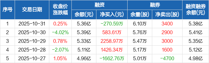 融资方面,当日融资买入2103.74万元,融资偿还2374.33万元,融资净偿还270.59万元。融券方面,融券卖出3400股,融券偿还0股,融券余量6.1万股,融券余额173.61万元。融资融券余额合计5.38亿元。