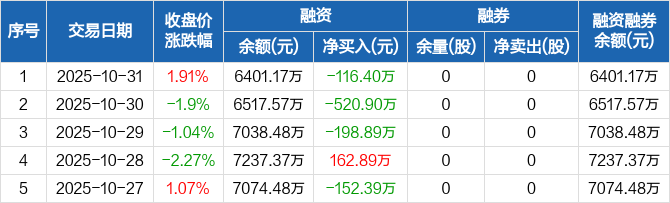 融资方面,当日融资买入322.05万元,融资偿还438.45万元,融资净偿还116.4万元,连续3日净偿还累计836.2万元。融券方面,融券卖出0股,融券偿还0股,融券余量0股,融券余额0元。融资融券余额合计6401.17万元。