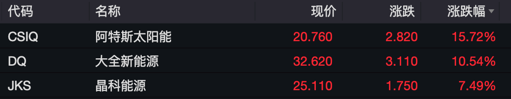 光伏板块中的个股集体走高,阿特斯太阳能涨近16%,大全新能源涨超10%,晶科能源的涨幅也在7%以上。