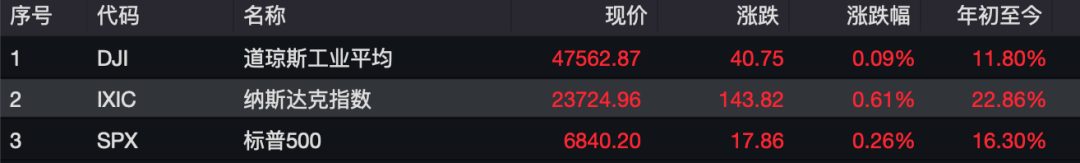 截至收盘,道琼斯指数涨0.09%,报47562.87点;标普500指数涨0.26%,报6840.20点;纳斯达克指数涨0.61%,报23724.96点。本周,道琼斯指数累计上涨0.75%,标普500指数累涨0.71%,纳斯达克指数累涨2.24%,均连涨三周;本月,道琼斯指数和标普500指数分别累涨2.51%和2.27%,连涨第六个月;纳斯达克指数累涨4.7%,连涨七个月。