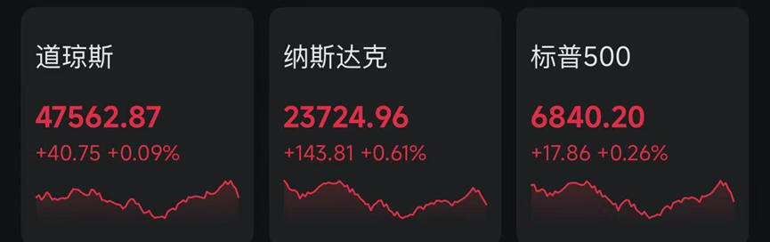 当地时间周五,美股三大指数收涨。截至收盘,道指涨0.09%,报47562.87点;纳指涨幅0.61%,报23724.96点;标普500指数0.26%,报6840.20点。
