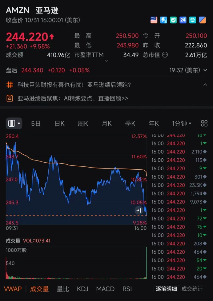 当地时间周五,美股科技巨头亚马逊开盘涨逾12%,最终收涨超9%,报244.22美元/股,股价创历史新高。