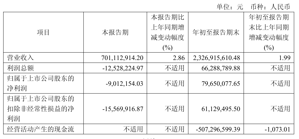其中第三季度,公司营业收入为7.01亿元,同比上升2.9%;归母净利润自去年同期亏损4443万元变为亏损901万元,亏损额有所减少;扣非归母净利润自去年同期亏损4939万元变为亏损1557万元,亏损额有所减少。