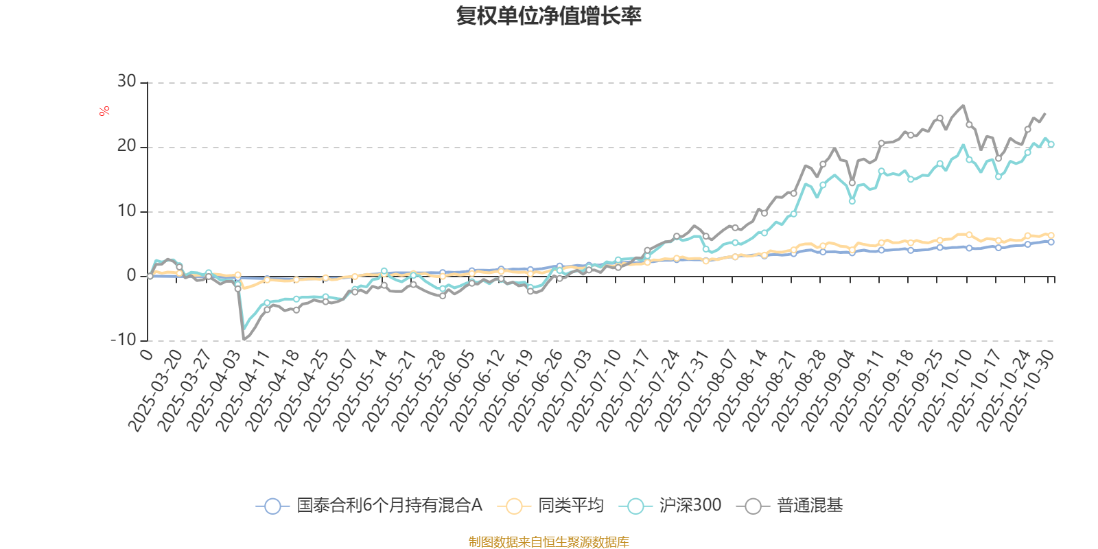 截至10月30日,国泰合利6个月持有混合A近三个月复权单位净值增长率为2.68%,位于同类可比基金292/629;近半年复权单位净值增长率为5.57%,位于同类可比基金311/629。