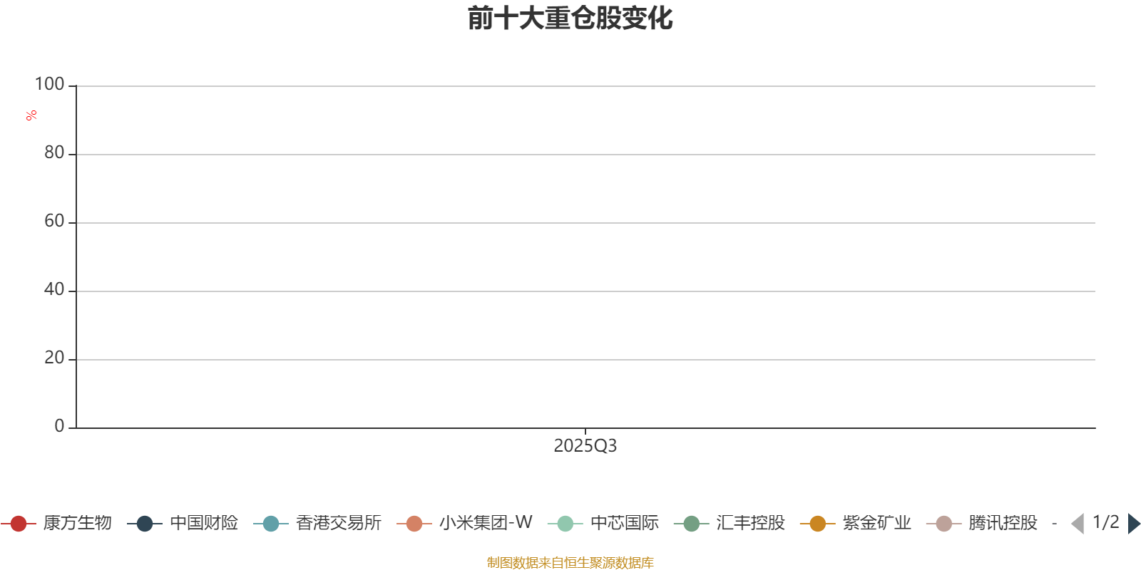 截至2025年三季度末,基金十大重仓股分别是阿里巴巴-W、腾讯控股、中芯国际、紫金矿业、小米集团-W、康方生物、香港交易所、美团-W、汇丰控股、中国财险。