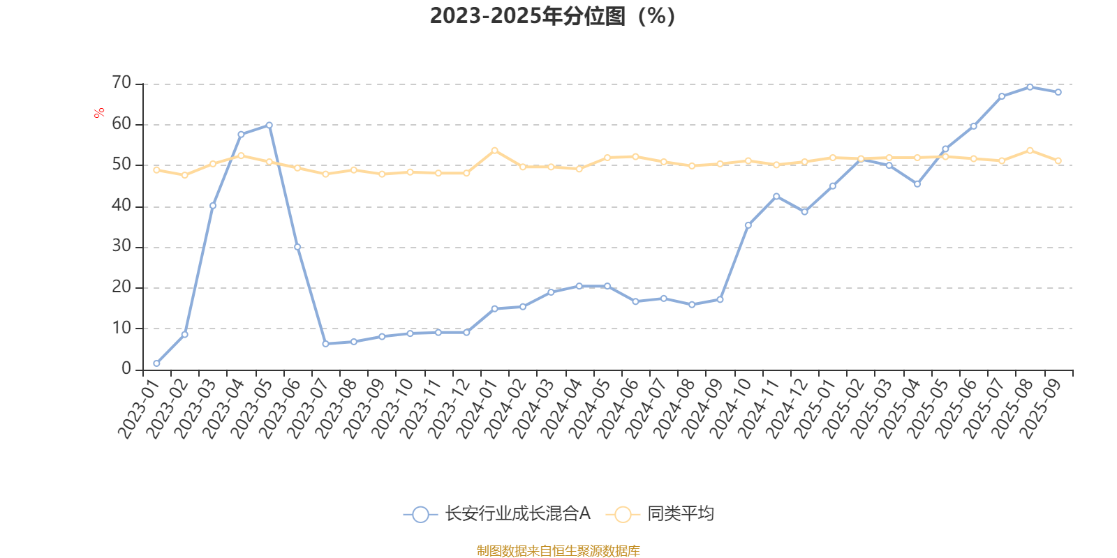 通过所选区间该基金净值增长率分位图,可以观察该基金与同类基金业绩比较情况。图为坐标原点到区间内某时点的净值增长率在同类基金中的分位数。