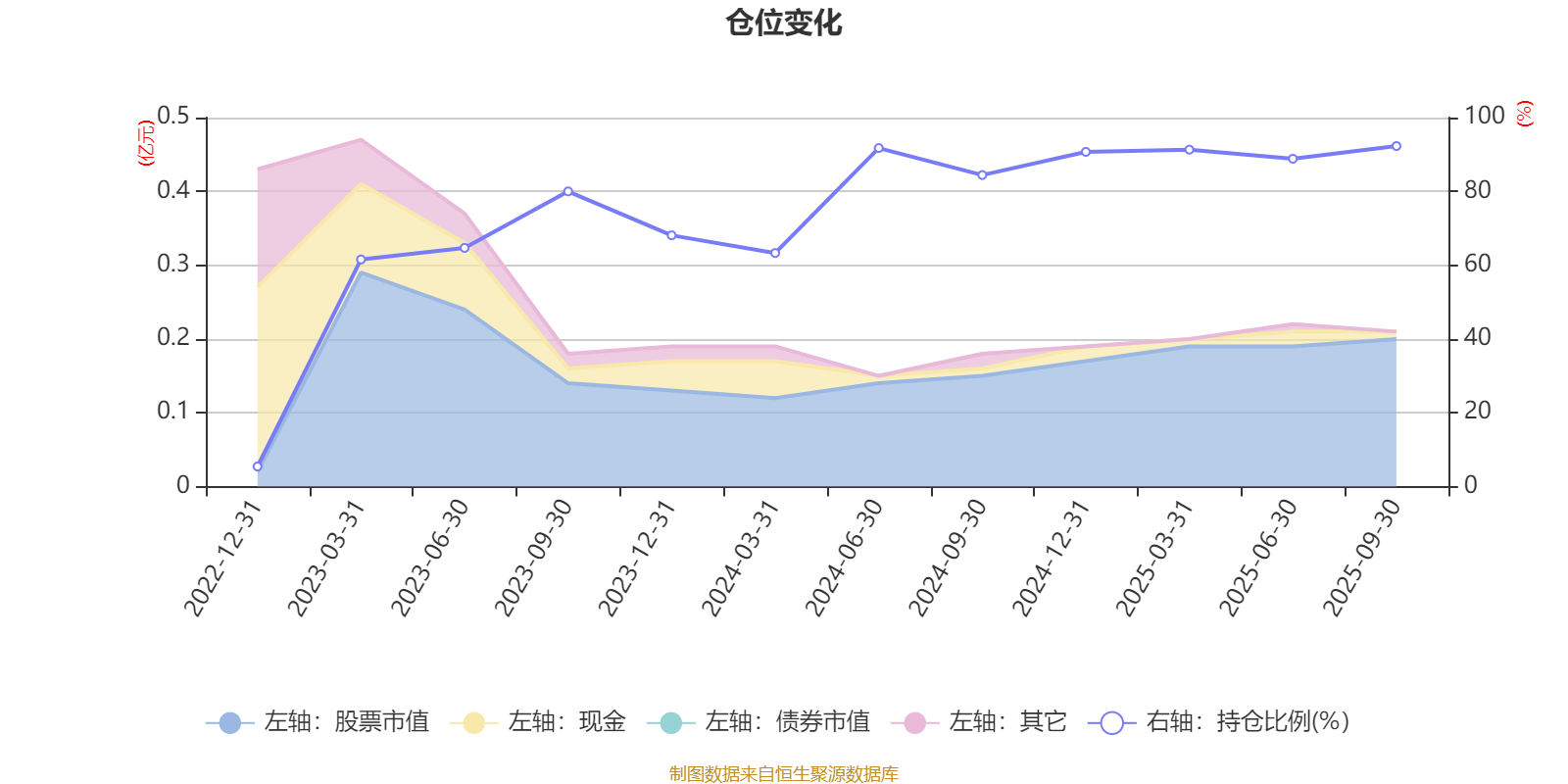 据定期报告数据统计,近三年平均股票仓位为73.54%,同类平均为83.73%。2025年三季度末基金达到92.29%的最高仓位,2022年末最低,为5.45%。