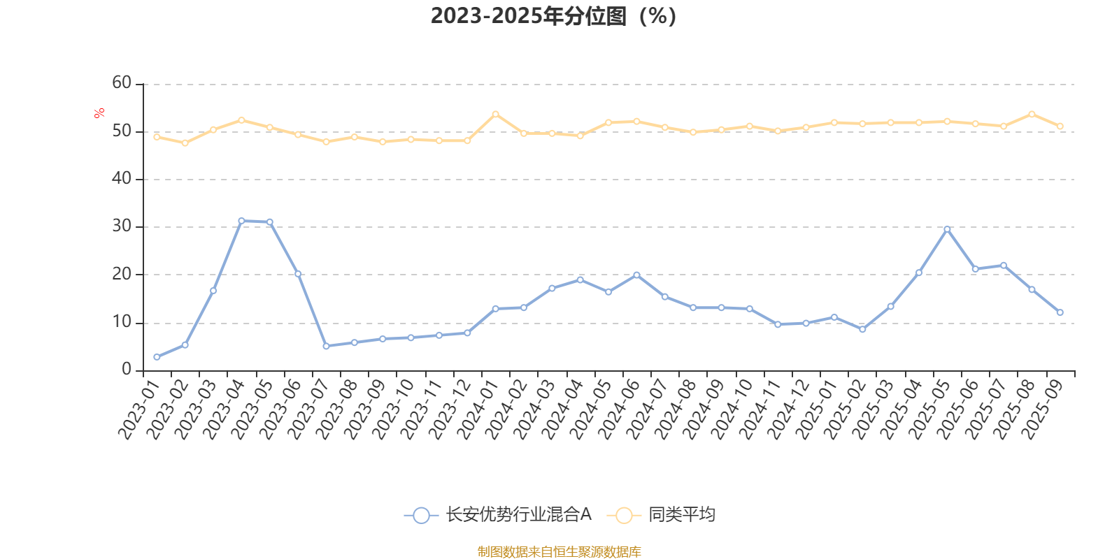 通过所选区间该基金净值增长率分位图,可以观察该基金与同类基金业绩比较情况。图为坐标原点到区间内某时点的净值增长率在同类基金中的分位数。