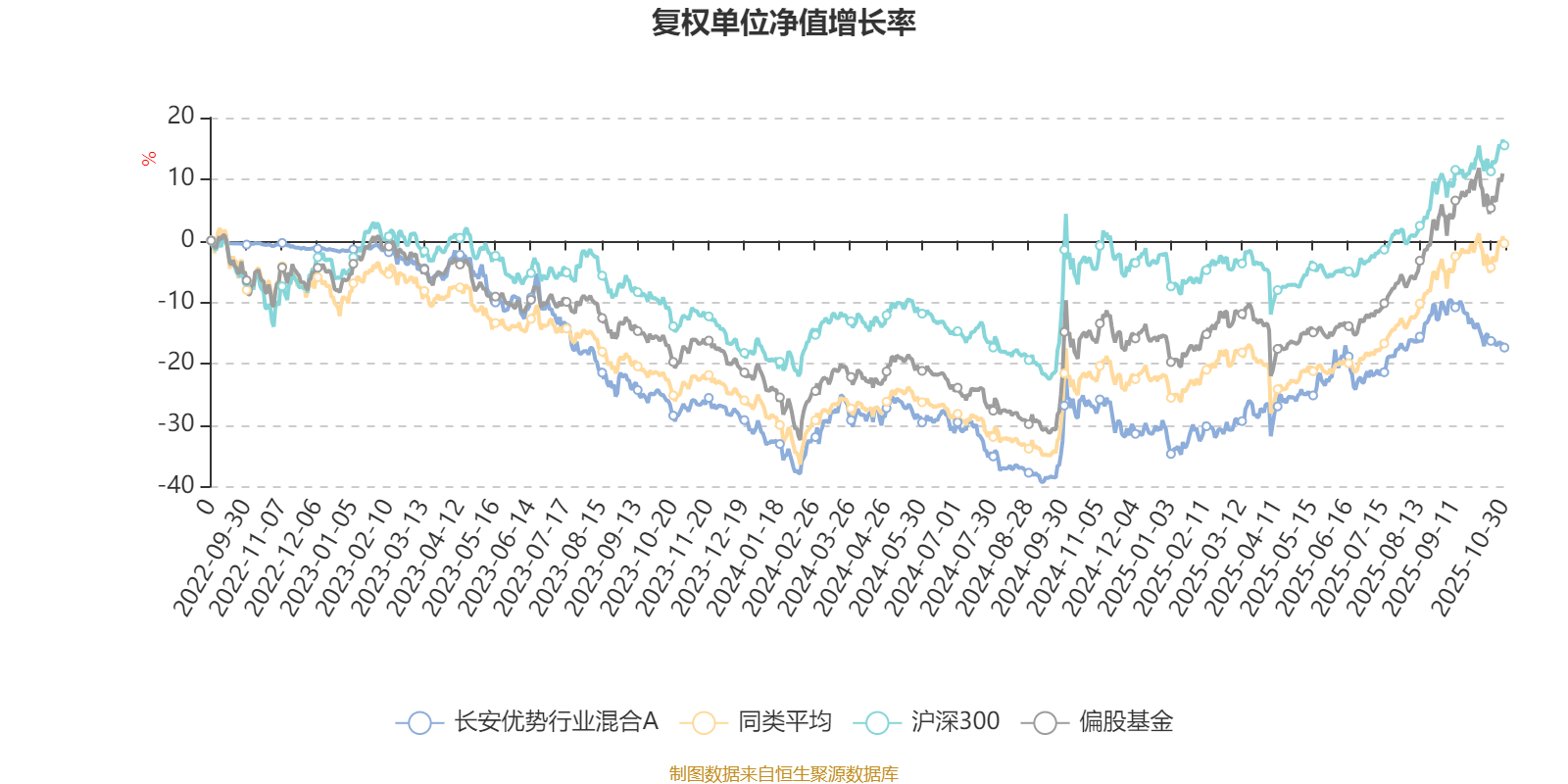 截至10月30日,长安优势行业混合A近三个月复权单位净值增长率为0.01%,位于同类可比基金654/689;近半年复权单位净值增长率为10.13%,位于同类可比基金629/688;近一年复权单位净值增长率为13.03%,位于同类可比基金552/658;近三年复权单位净值增长率为-16.67%,位于同类可比基金332/364。