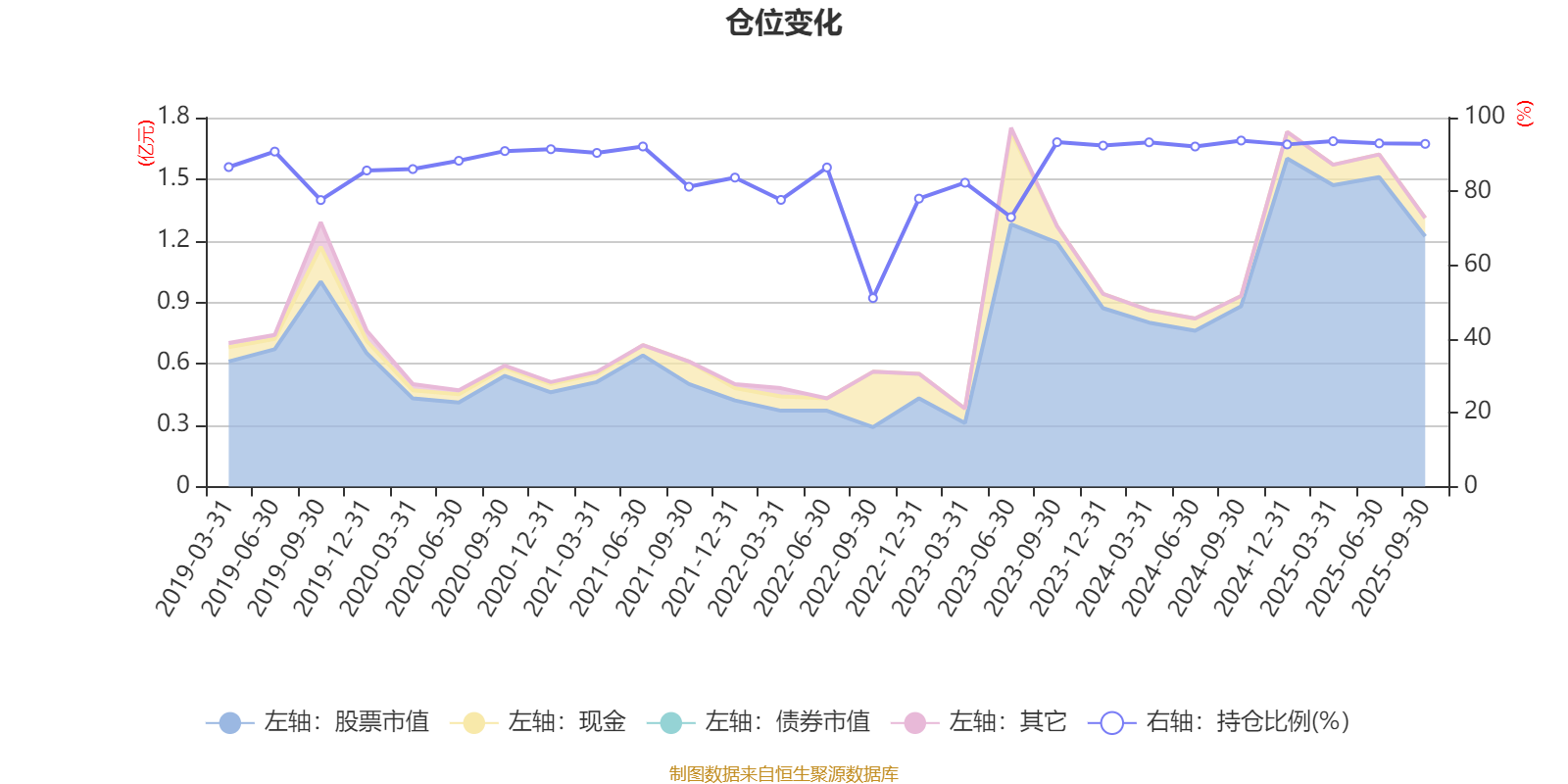 据定期报告数据统计,近三年平均股票仓位为89.22%,同类平均为72.35%。2024年三季度末基金达到93.78%的最高仓位,2022年三季度末最低,为51.09%。