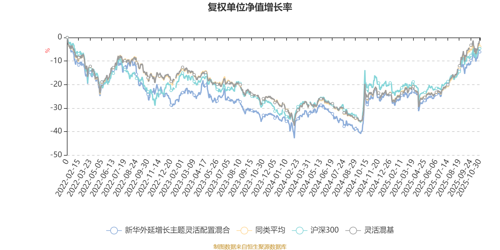 截至10月30日,新华外延增长主题灵活配置混合近三个月复权单位净值增长率为12.28%,位于同类可比基金618/1287;近半年复权单位净值增长率为28.88%,位于同类可比基金493/1287;近一年复权单位净值增长率为26.66%,位于同类可比基金553/1287;近三年复权单位净值增长率为23.87%,位于同类可比基金485/1286。