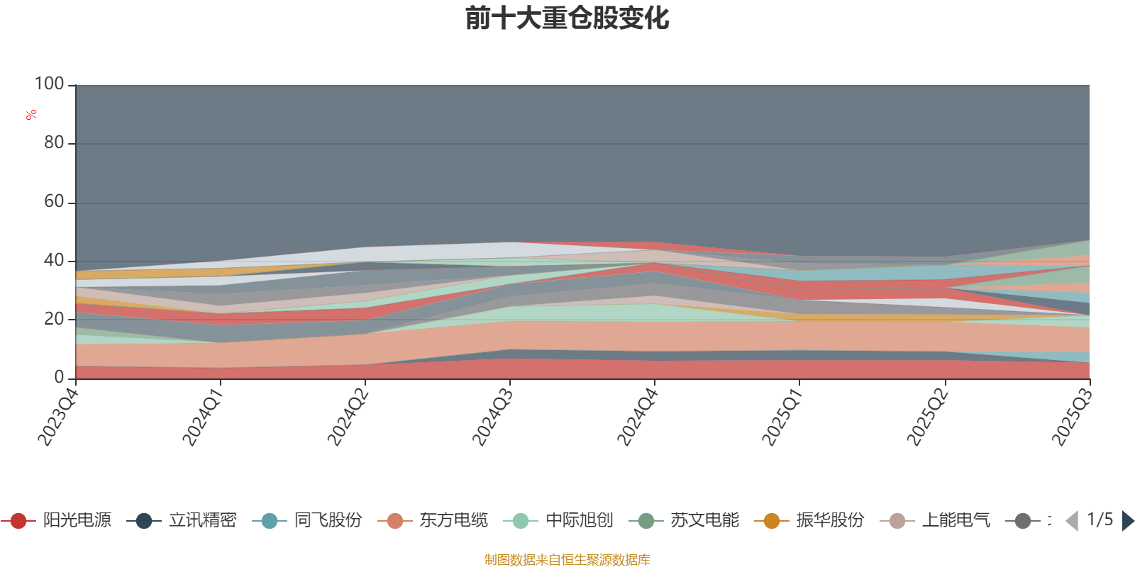 截至2025年三季度末,基金十大重仓股分别是东方电缆、寒武纪、阳光电源、鼎通科技、大金重工、中际旭创、三花智控、同飞股份、生益科技、海力风电。