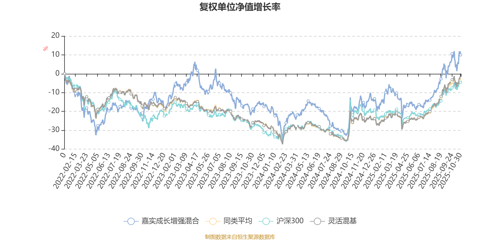 截至10月30日,嘉实成长增强混合近三个月复权单位净值增长率为20.94%,位于同类可比基金339/1287;近半年复权单位净值增长率为32.50%,位于同类可比基金427/1287;近一年复权单位净值增长率为35.60%,位于同类可比基金351/1287;近三年复权单位净值增长率为33.33%,位于同类可比基金324/1286。